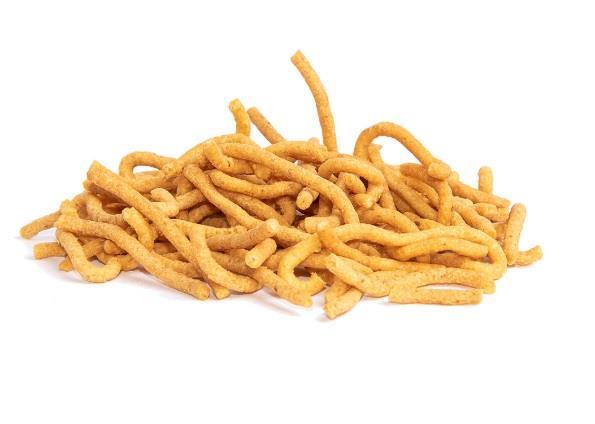 Sev is a popular Indian snack food consisting of small pieces of crunchy noodles made from chickpea flour paste, which are seasoned with turmeric, cayenne, and ajwain before being deep-fried in oil. These noodles vary in thickness.
