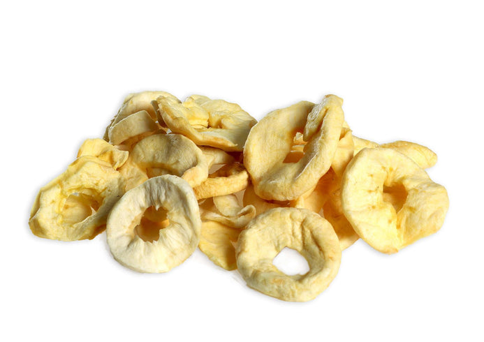 Dried apples, or apple rings, make a great light snack. Our dried apples are of the highest quality and are packed with natural sweetness, so we saw no need to sweeten them with added sugar of any kind. Top an apple coffee cake with dried apples for an interesting, wholesome look or snack on them alone or with other dried fruit. Kosher and gluten-free.