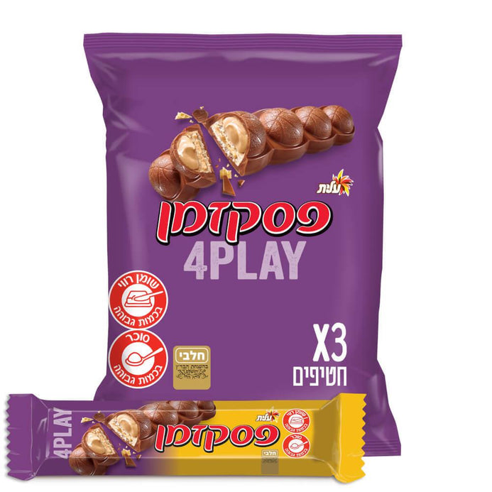 New Pesek Zman! 4Play :A thickened version with a basketball look, which includes a waffle, nougat, chocolate and milk cream and nuts, has 4 cubes with a basketball stamp on each of them.
